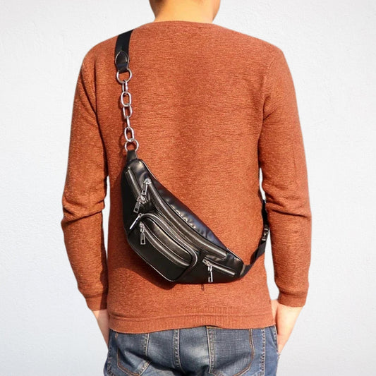 - Le sac banane en cuir noir, pour un look sobre et raffiné