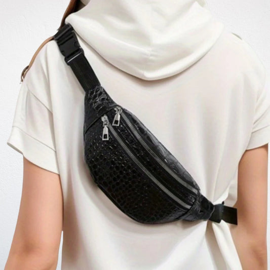 Pour les occasions spéciales, tu peux choisir une sacoche banane ornée de strass, en cuir verni ou métallisé, avec des accessoires dorés ou argentés. Ce style fait briller ta silhouette et attire l’attention.